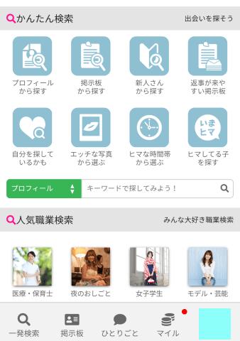 また、実際に検索する内容も、色々な検索項目があり、例えば、「エッチ度」や「職業」などで探すことが出来ます。