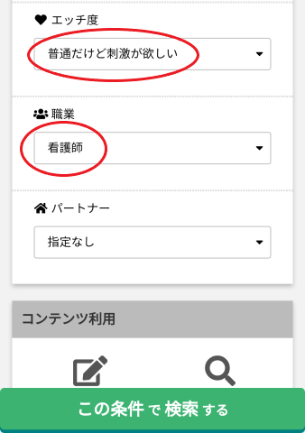 「エッチは、普通だけど刺激が欲しい看護師さん」という検索も可能です。