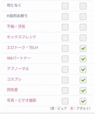 一般的には、望む利用目的では、ピュア系のジャンルにチェックをつけ、逆に、望まない利用目的では、アダルト系のジャンルにチェックをつけていきます。