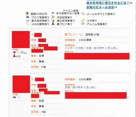 ①自分のプロフィール=女性の望む相手になった場合のみ、女性の検索結果一覧に自分のプロフィールが表示されます。