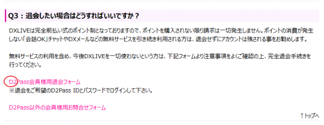 今後DXLIVEチャットは、一切使わないという方は、下記、ヘルプにある「D2Pass会員様用退会フォーム」から退会してください。