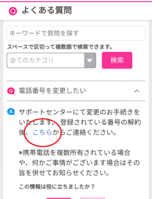 更に、「電話番号を変更したい」の中にある、サポートセンターにて・・・・こちらをタップします